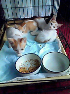 4匹保護して、タオルでゴシゴシ拭き上げて、ムギちゃんのとは違う別のケージに入れて、水とふやかしたカリカリをあげて、現在そのまま放置。オス3匹メス1匹。